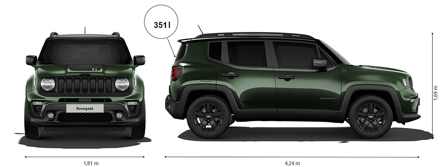 A Jeep® Renegade e-Hybrid megadja mindazt a kényelmet és teret, amelyre minden utazás során szüksége van. Méretét tekintve a Renegade 4xe Plug-in Hybrid 1,69m magas, hosszúsága 4.24 méter, szélessége 1,81 méter. A méretek a felszereltségtől függően kis mértékben eltérhetnek.